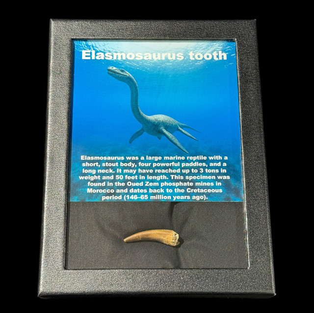 This genuine elasmosaur tooth is in good condition with only minor repair and/or restoration meticulously performed to maintain this specimen's integrity. This specimen is professionally presented in a glass case with a label.