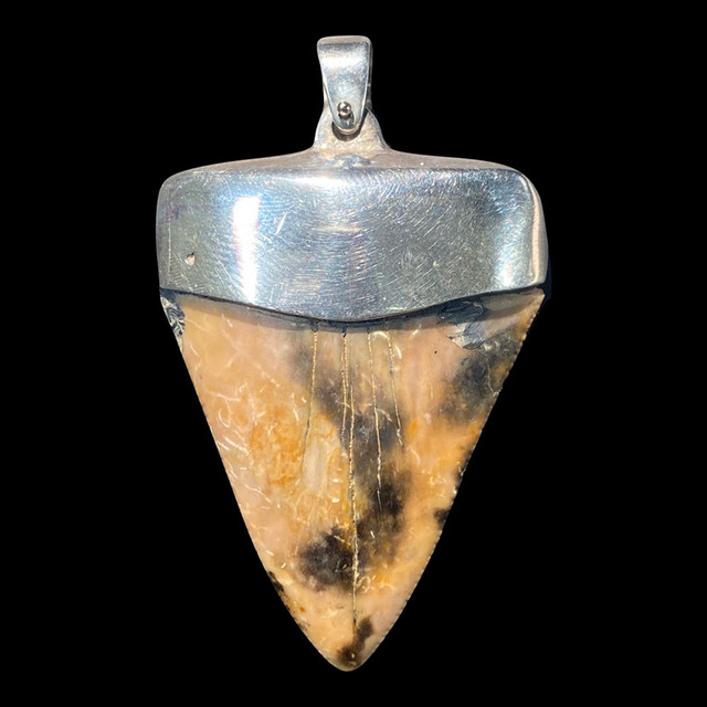 This fossil great white shark tooth pendant was made using a top quality great white fossil shark tooth. It is set in sterling silver. This tooth is exceptionally large and well preserved with all the serration intact, it also features beautiful color.