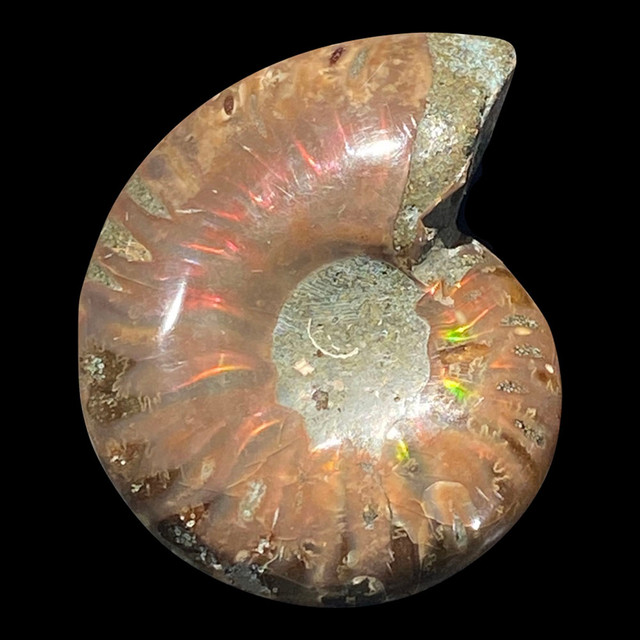 Iridescent ammonite featuring stunning iridescent colors created by bands of aragonite that reflect the light like a prism effect. This specimen features beautiful color on both sides, it would make a great addition to an fossil collection.