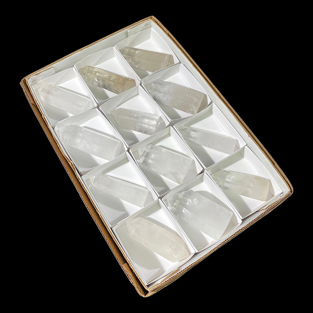 This is a wholesale lot of 12 quartz crystals from Madagascar. The crystals vary slightly in size. They all have a flat base so they can stand upright.
