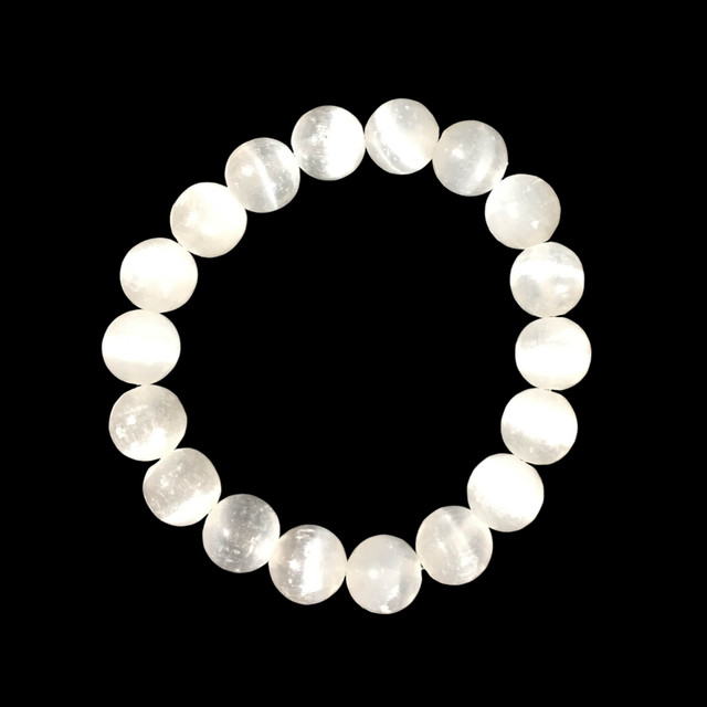 This unique bracelet is made from 8mm selenite beads. Selenite is a varietal name of Gypsum, which is one of the more common minerals in sedimentary environments. It's primarily composed of Hydrated Calcium Sulphate, it forms when limestone is attacked by sulphuric acid.The resulting product is larger than its components so can be 'squirted' through pores in the rock under pressure, whilst in crystalline form. It is a major rock forming mineral that produces massive beds, usually from precipitation out of highly saline waters. Since it forms easily from saline water, gypsum can have many inclusions of other minerals and even trapped bubbles of air and water. Gypsum has several variety names that are widely used in the mineral trade.