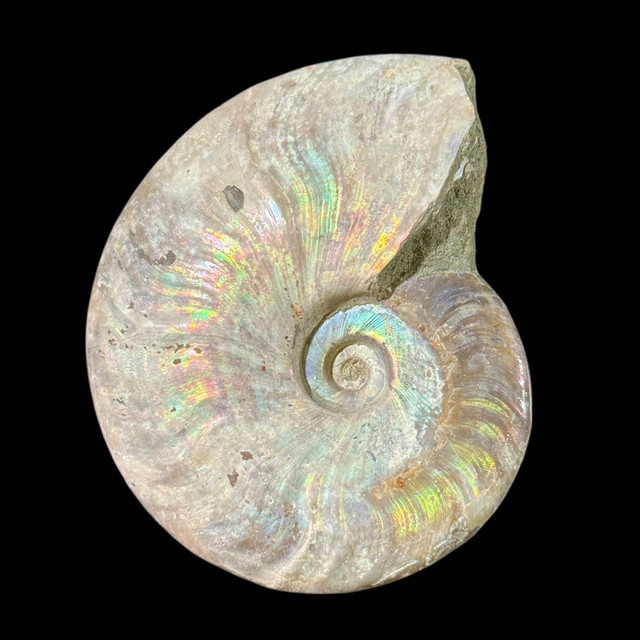 This exquisite iridescent ammonite fossil from Madagascar shimmers with vibrant flashes of blue, green, and rainbow hues, a natural display of ancient beauty frozen in stone. Once a marine cephalopod that thrived over 65 million years ago, this ammonite’s shell has mineralized into a dazzling, gem-like surface through millions of years of fossilization and preservation.