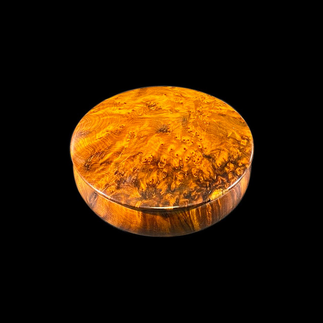 The Thuya tree is a Coniferous tree indigenous to the Western Atlas mountains of North Africa; its burl is a dense wood with a high oil content. Its color varies from rich golden brown to nearly black. This unique tree produces a large underground root with many outgrowths. The Greeks named it “Thuya” meaning sacrifice, because they used an oil distilled from it as incense in their religious ceremonies Our Thuya wood products are lovingly hand made by local craftsman in a small coastal town called Essaouira in Morocco. The finish that’s been applied to them is a hand rubbed shellac. This Thuya wood large mushroom box is ideal for keepsakes or jewelry.