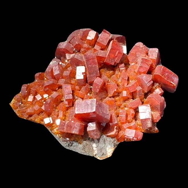 Vanadinite is a mineral made up of lead vanadate and chloride. It is found in yellowish, brownish, or ruby red hexagonal crystals. Our vanadenite specimens were found in "Mibladen" near the Midelt region in the Atlas Mountains in Morocco, which is considered to be one of the richest mineral formations in the world.