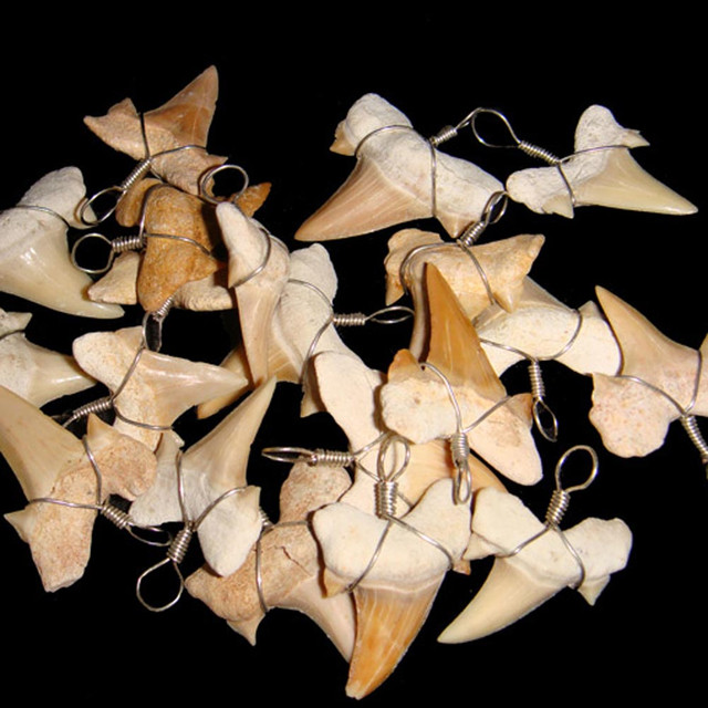 These wire wrapped shark teeth belonged to an "Otodus obliques" shark which was a prehistoric shark related to the modern mackerel shark. Scientists estimate that it may have grown up to 30' in length. Ododus was a wide-spread species, its remains have been found in Africa, Asia, North America, and Europe. The Teeth of this shark are large (up to 4") with smooth cutting edges.